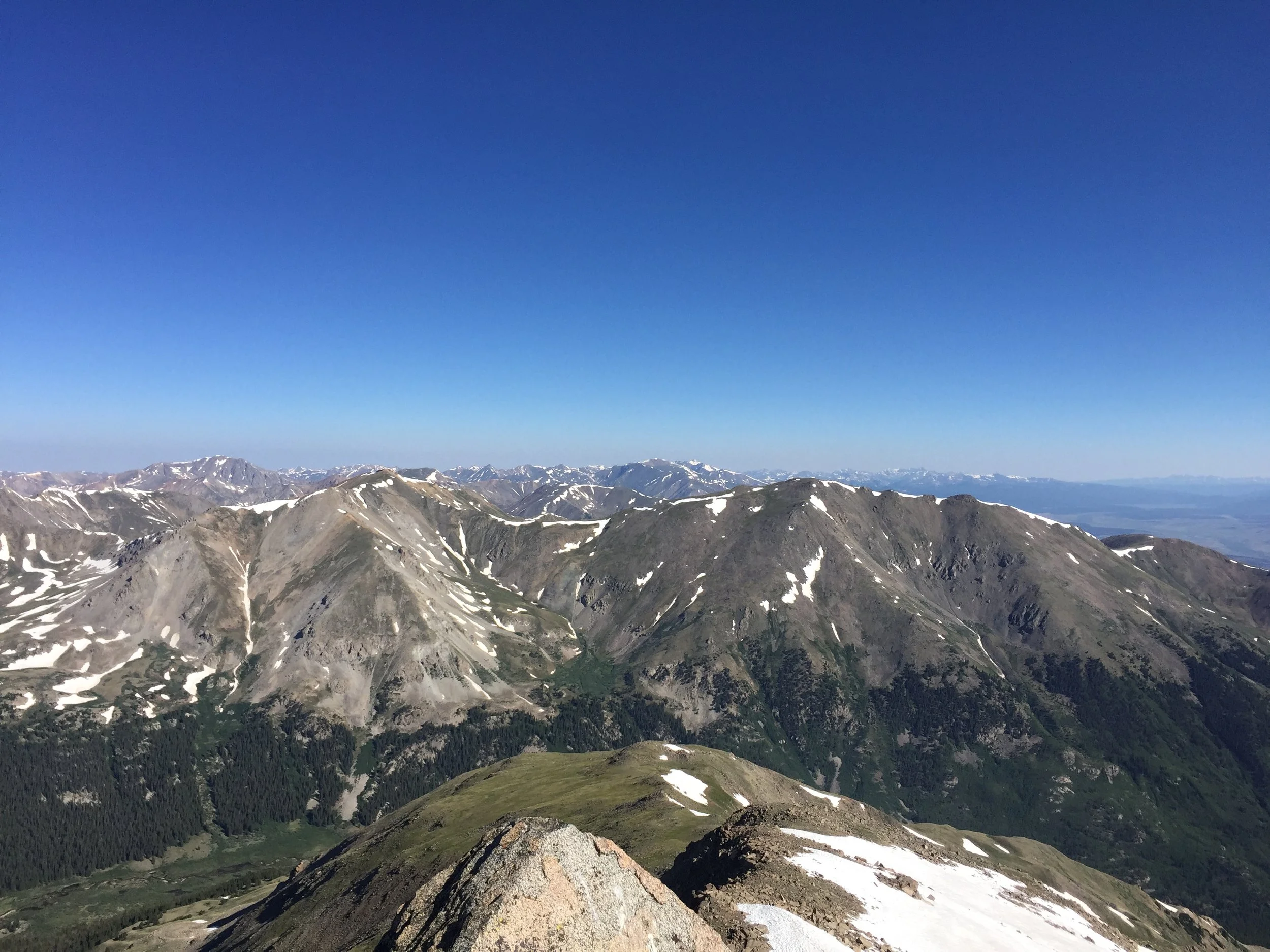 Today I completed my first circuit of the 14,000-foot peaks of the Sawatch Range, which I began three years ago. The Harvard-Columbia Traverse from trailhead back to trailhead in one day was the last objective on my list. It's daunting. 15 miles, 6100 ft of elevation gain. Route finding challenges between the two peaks that catch many off-guard and result in frequent search and rescue missions. There's still a bunch of snow. The descent from Columbia is a total disaster! The list goes on...