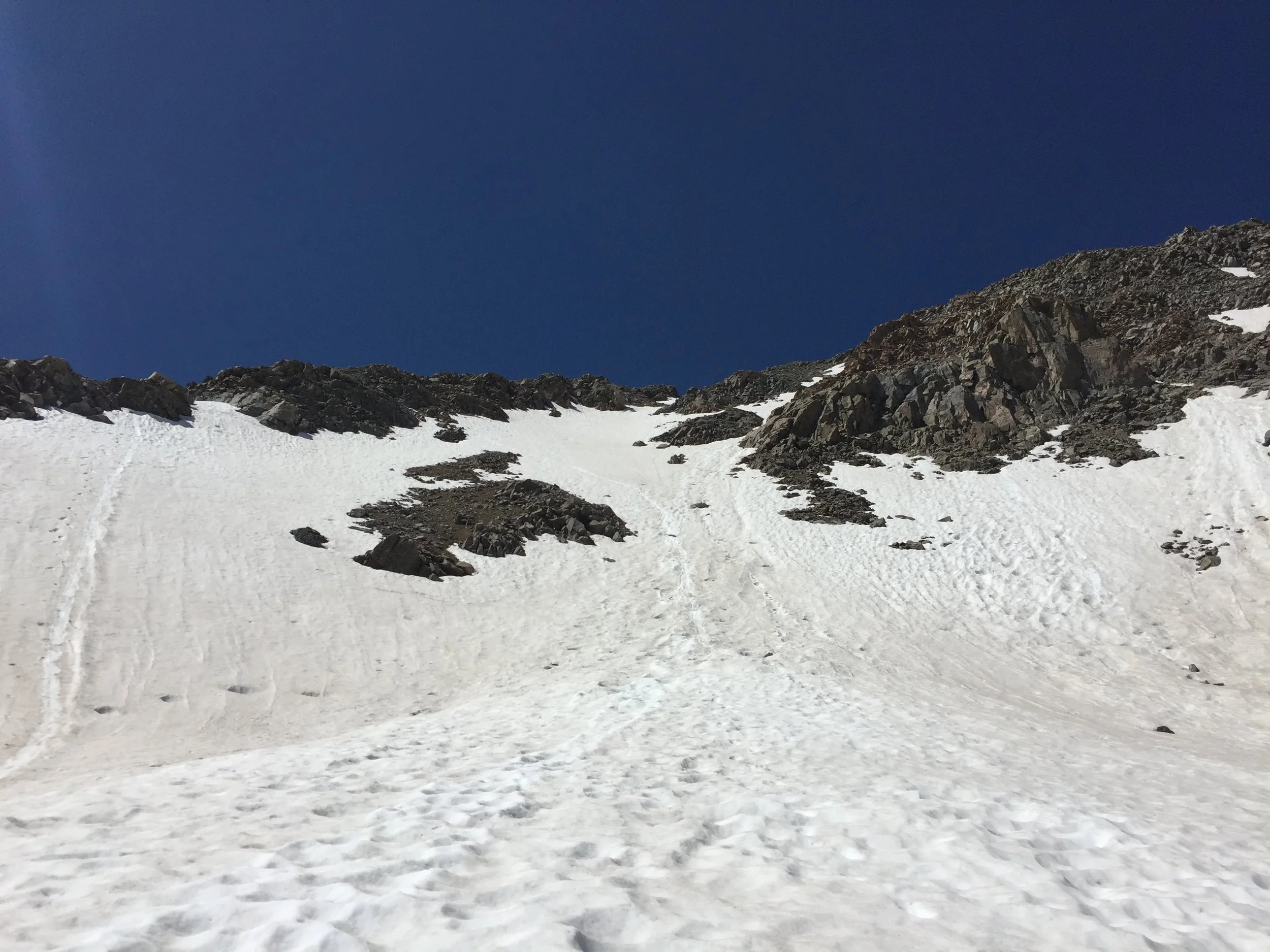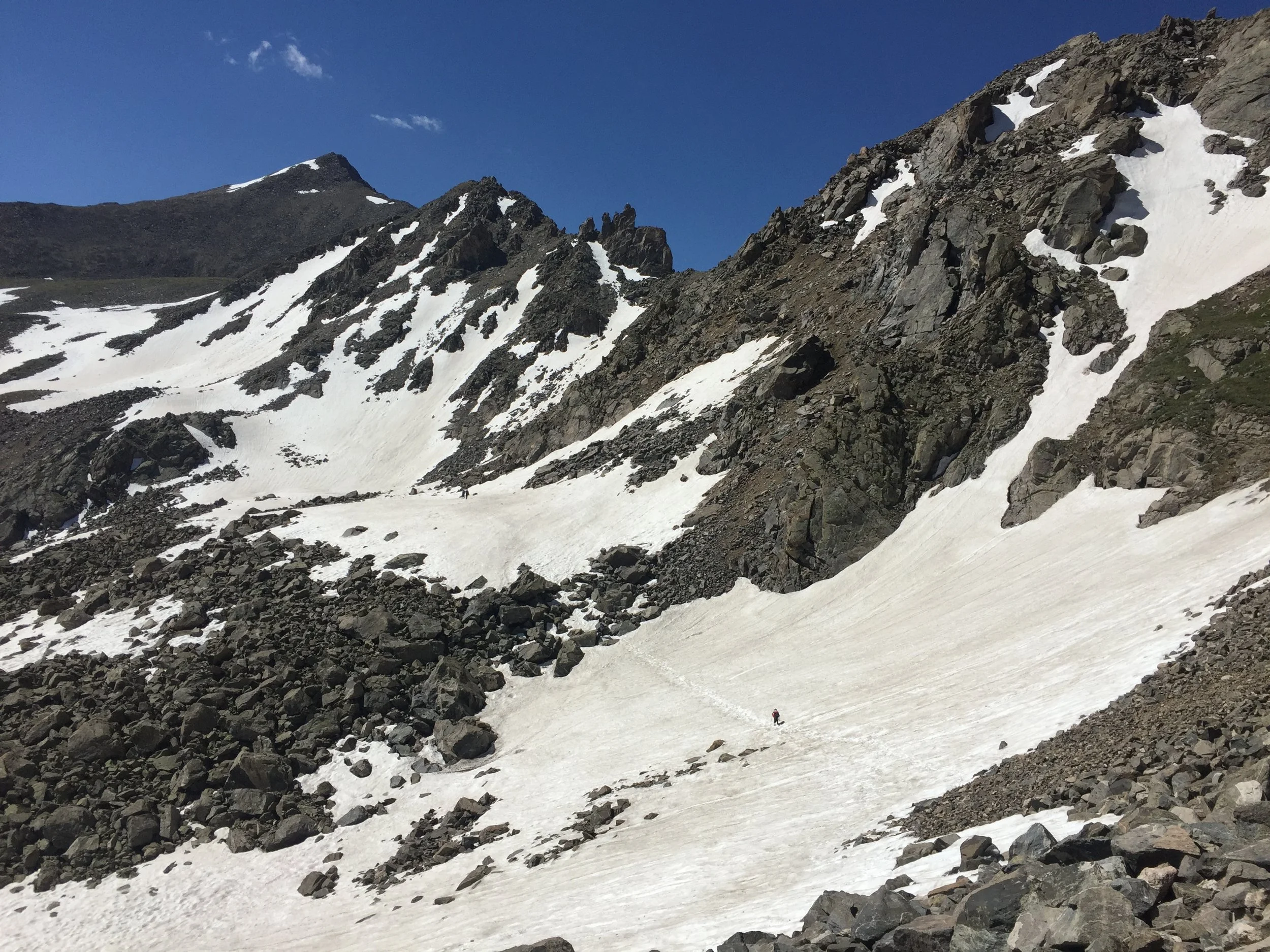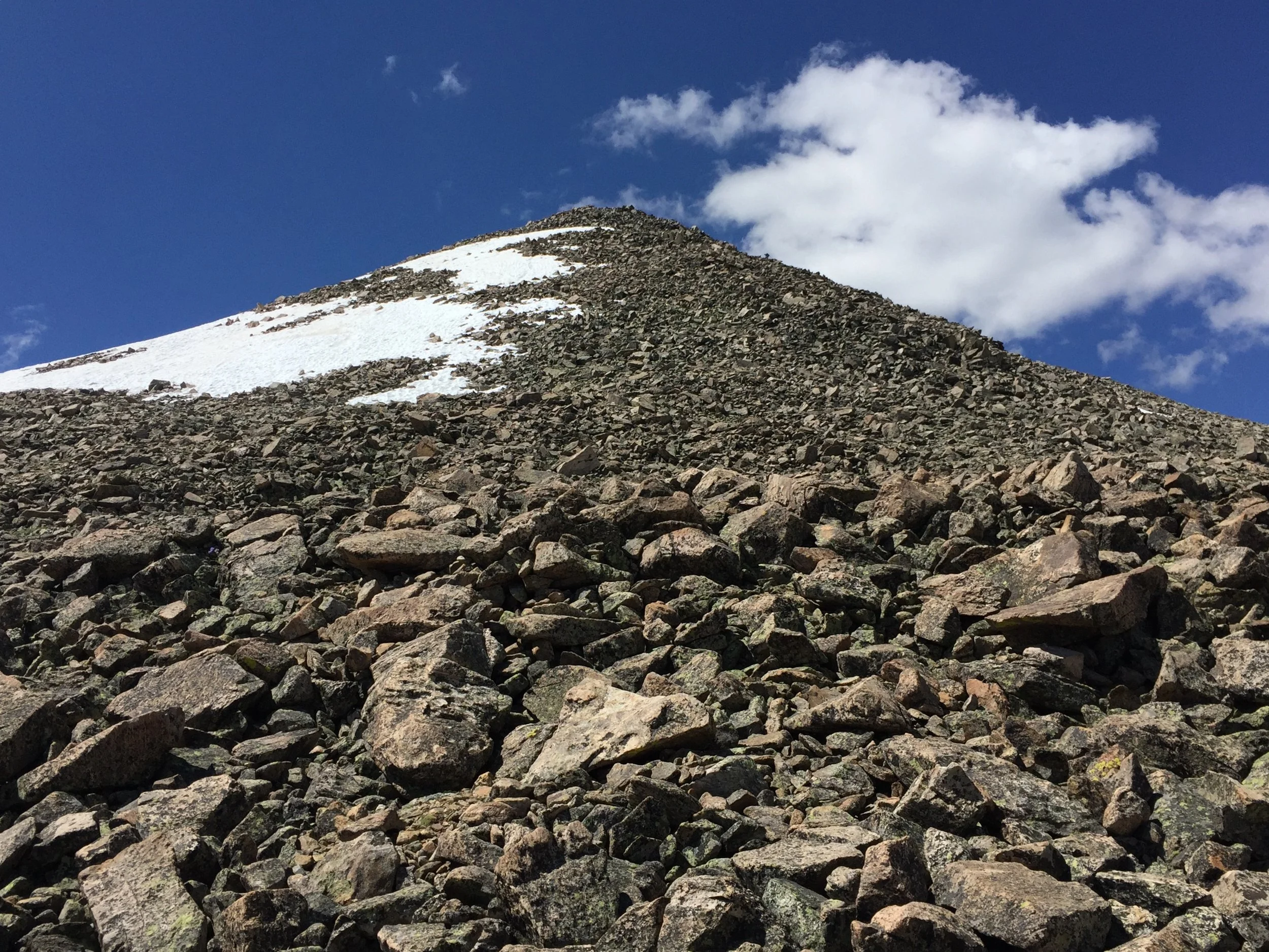 Surveying the clouds and determining all was clear, I headed down Harvard’s long east ridge. I had a couple more strong hikers begin the traverse just ahead of me, so that put me very much at ease. At the pivotal decision-making point on the east side of the jagged ridge of death, I went with my gut, dropped down a little earlier than recommended, and ended up downclimbing a bunch of steep boulders. Better than the scree-filled gullies higher up, though. No big deal. Then it was time to put on the spikes and rip up those snowfields! The snow was probably easier than all the talus would have been (and I fucking love bounding up some talus).