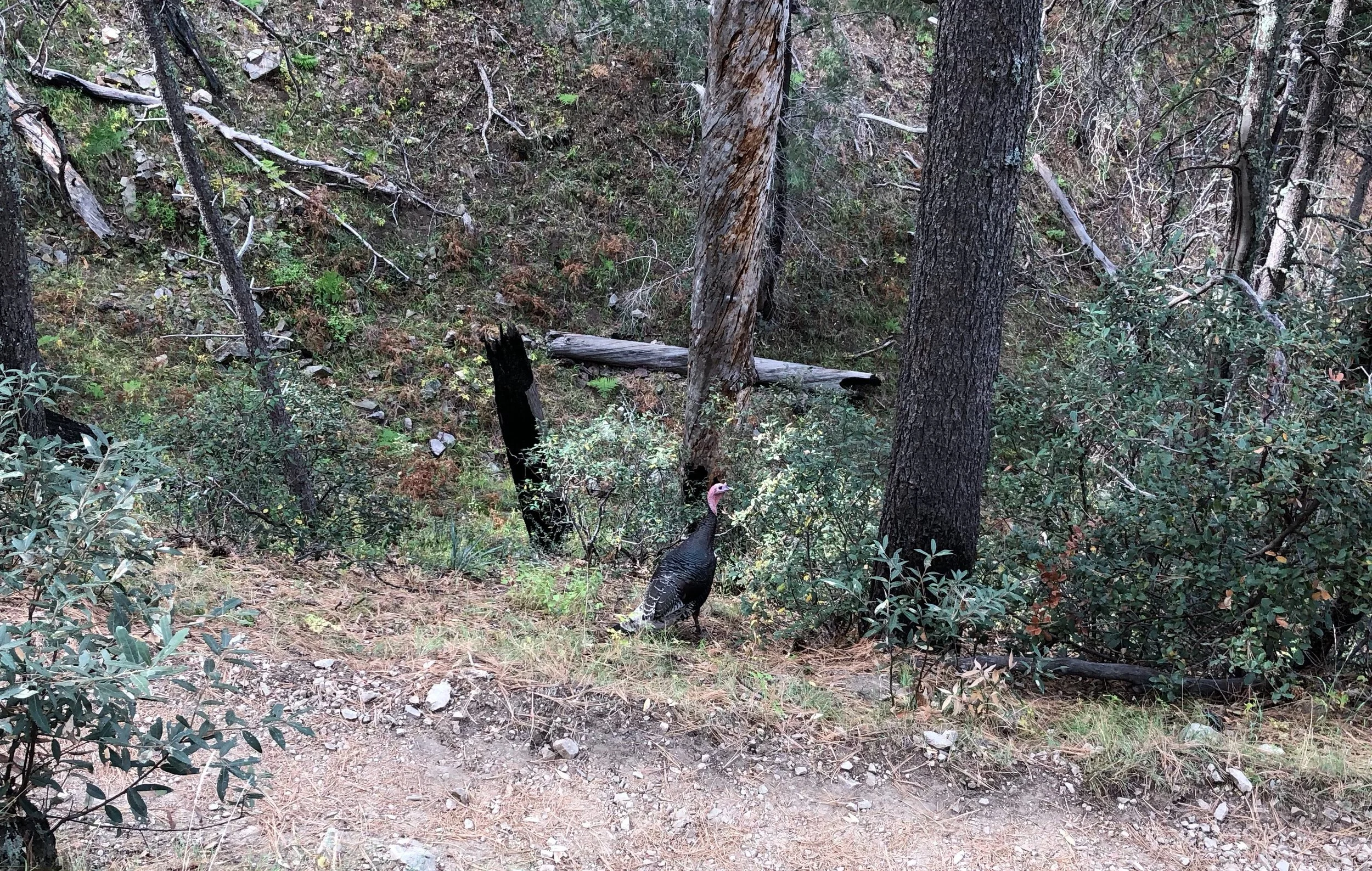 The hike begins at a high enough elevation that that there is no Saguaro component. It begins in pine forest and ends above a relatively low treeline. I didn’t see much in the way of wildlife, but it was a bit of a surprise to run into a group of wild turkeys about halfway back down. It definitely felt like an area that mountain lions would dig, and there have definitely been reports of black bears in Madera. Nothing registered on my Spidey-sense today, though.