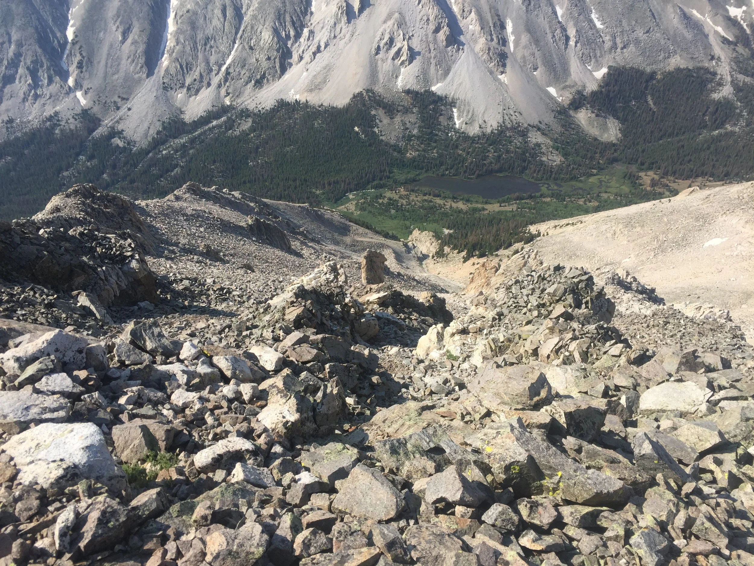 Due to a thunderstorm threat in the afternoon, I started hiking at 5am. I ascended Little Browns Creek for about 6 miles to its source, then swung around between various defunct 4wd roads and scrambled up Mt. White (13,667 ft). At 9am, the skies were perfectly clear with ridiculous views of Mt. Antero (where I was very recently) and Shavano and Tabeguache (both of which I hiked one year and one day ago)! The summit also looks down a steep dropoff down to Browns Lake, where I’d end up a bit later; should I have saved my legs a helluva lot of trouble and just taken a massive swan dive then and there?...