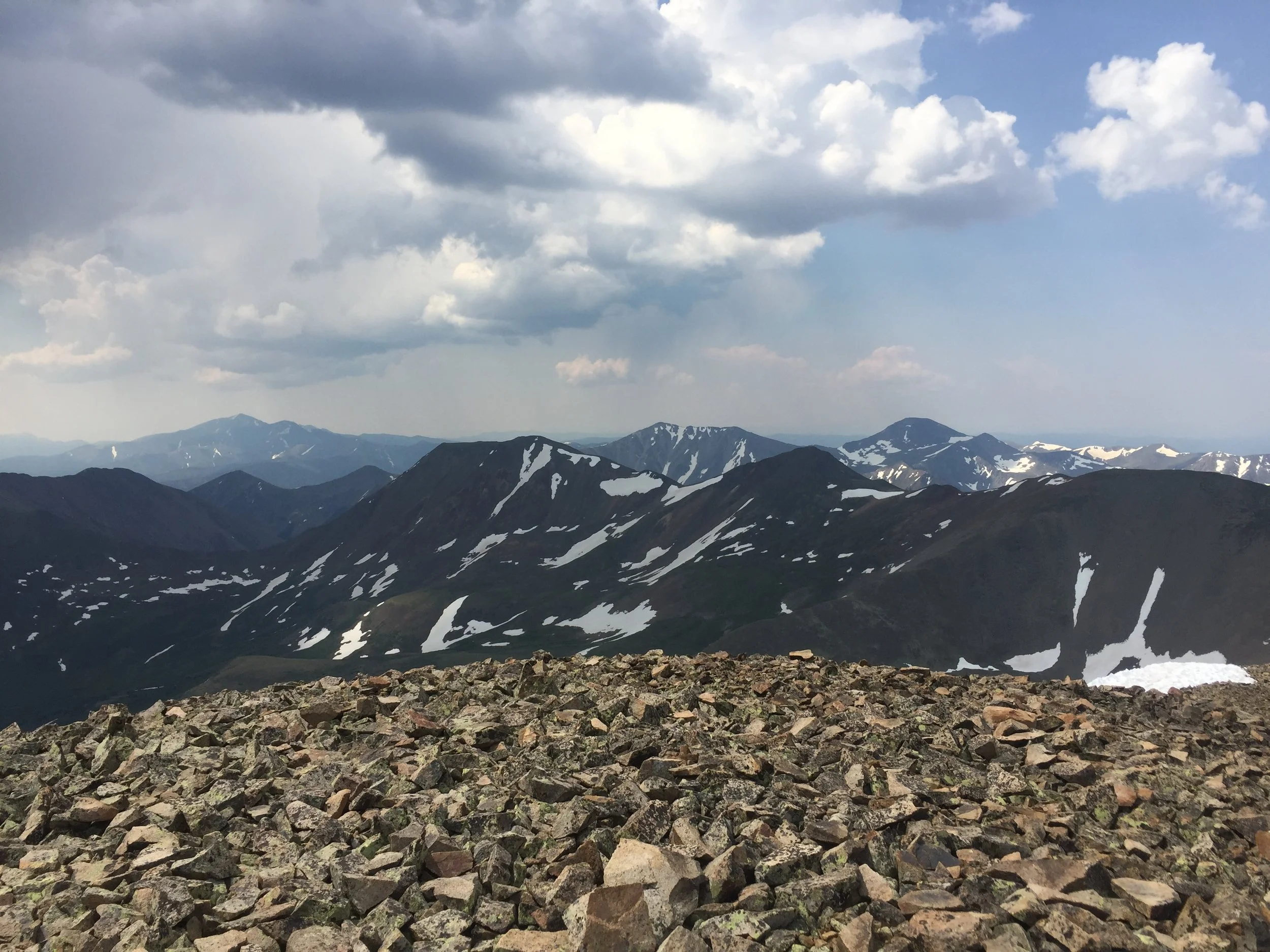 I then took off across a gorgeous alpine meadow to reach the southeast ridge of Cronin Peak (13,878 ft). If you saw any of the pics from our Antero hike a couple days ago, Cronin featured prominently. I just HAD to hike this colorful mountain; little did I know the next two hours would drive me to the brink of insanity. Despite being a striking mountain surrounded by epic views, the ridgeline itself offers no variety, just 1200 ft of loose AF, medium-sized shingles of talus to pick through. It’s just steep enough to offer the wonderful gift of false summits, the fourth of which damn near broke my heart. My legs were at failure point and the skies were getting very dark, but I kept pushing. When I finally reached Cronin’s summit, I only stayed about three minutes.